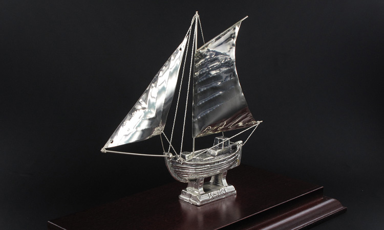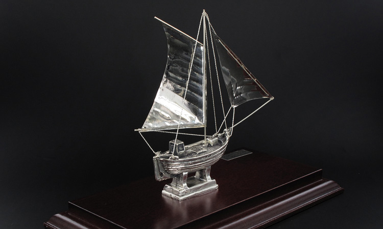 Kayki, made of silver leaf 925o, on a wooden base and plexiglass cover, dimensions 19x9x15 cm.