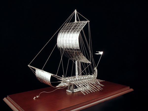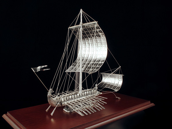 Ασημένια τριήρης, κατασκευασμένη από φύλλο αργύρου 925ο, σε βάση ξύλινη με κάλυμμα plexiglas, διαστάσεων 46x24x35 cm. Διατίθεται επίσης και με επίχρυσες λεπτομέρειες.